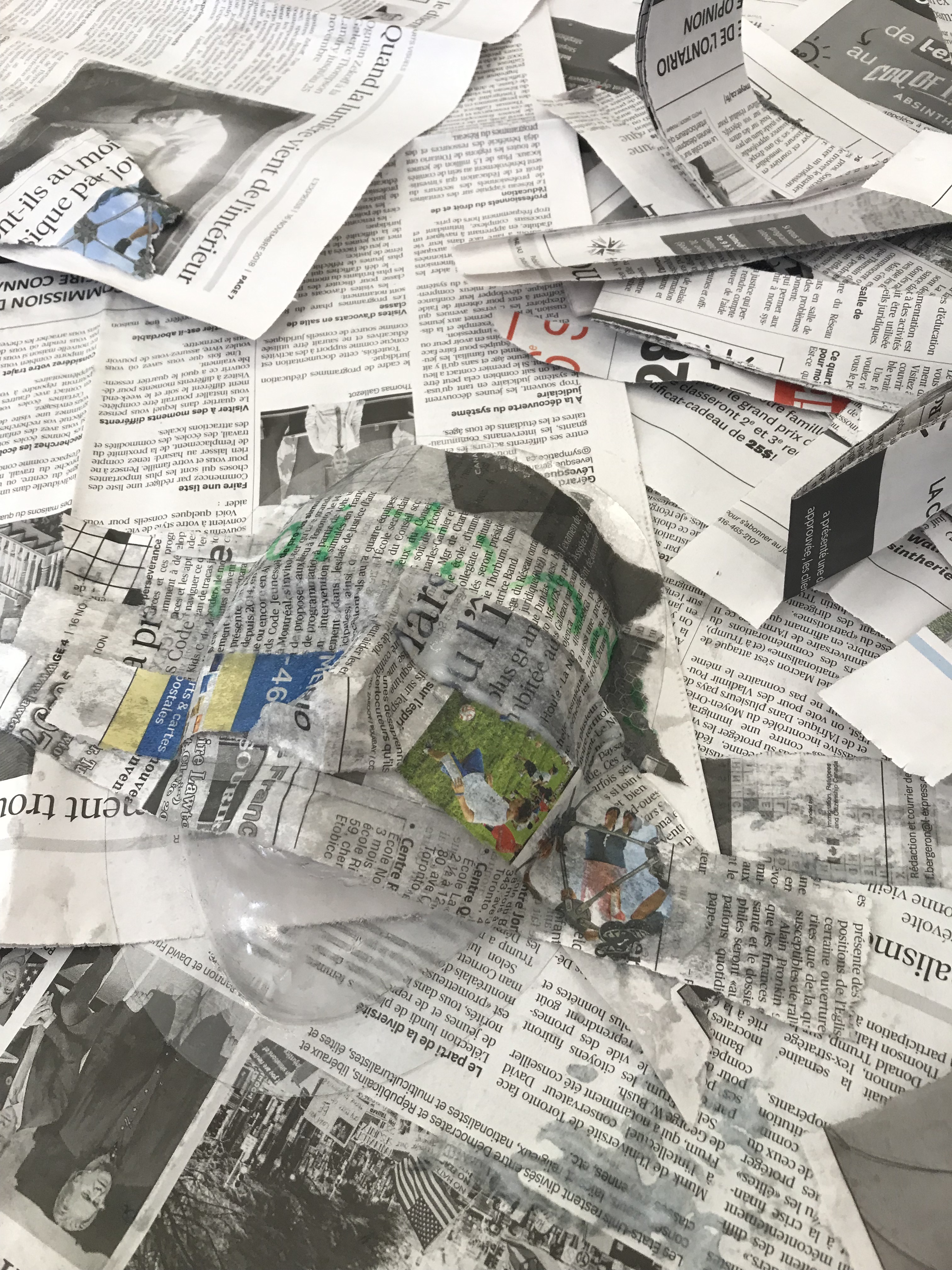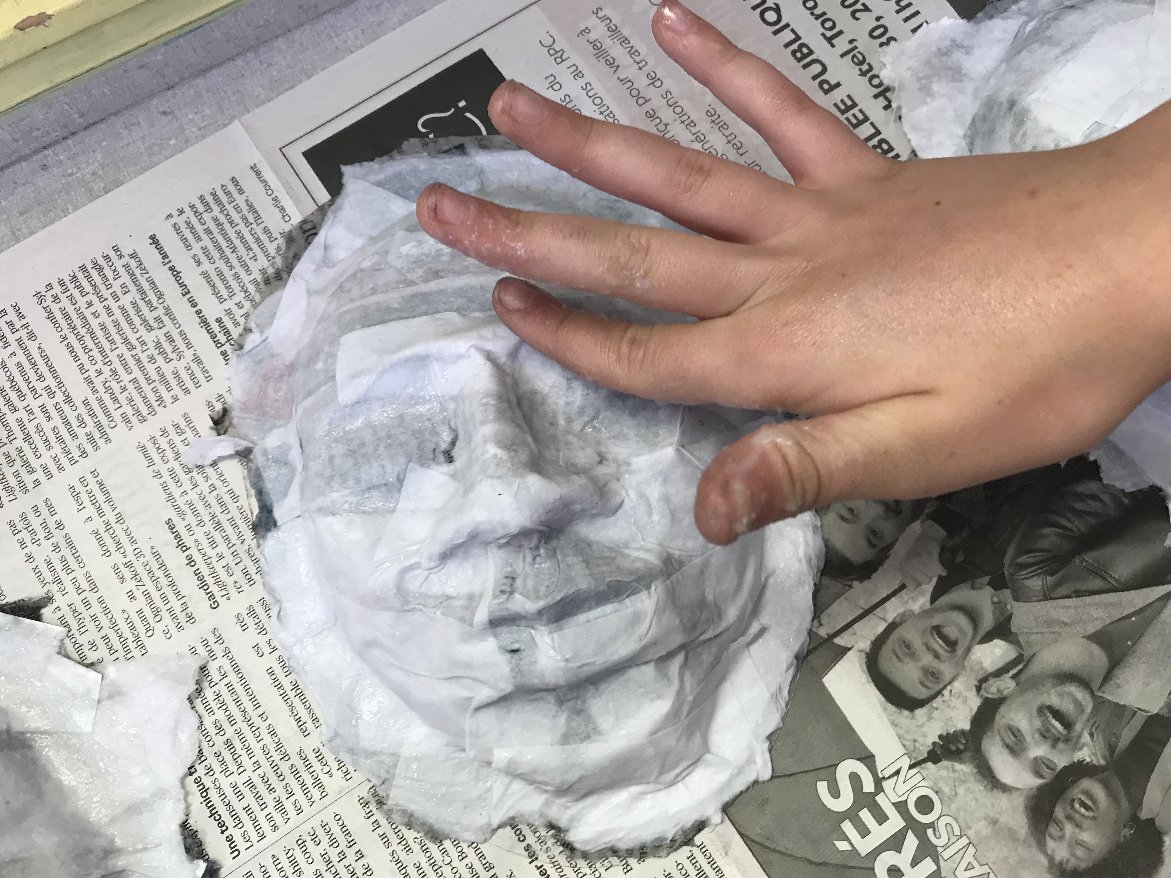 En partant de moules de visages en plastiques enduits de vaseline, il suffit de sculpter le visage au papier mâché, et d’ajouter une dernière couche de papier blanc qui permettra un meilleur rendu pour la peinture. Les détails de chaque personnalité représenté (selon les choix personnels des enfants, après avoir effectué des recherches et entendus des récits) sont ajouté à l’aide de divers matériaux (carton, glaise, rouleaux) et peints.