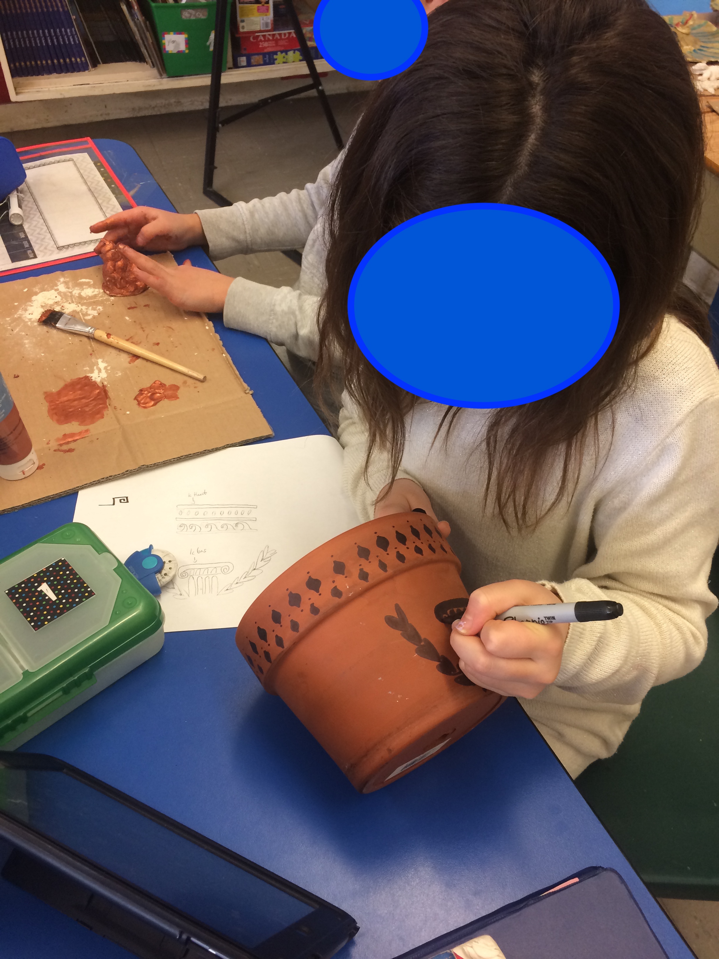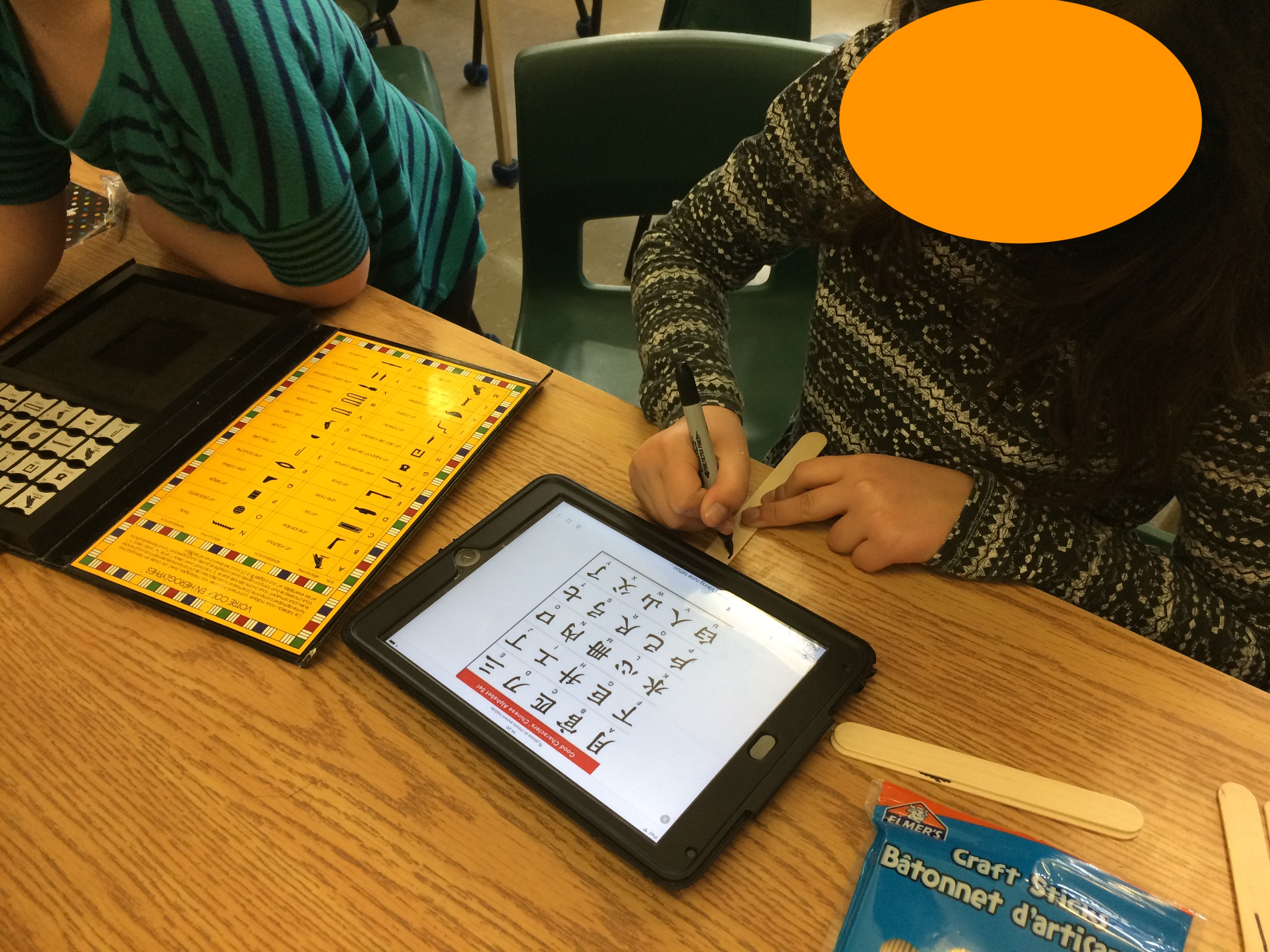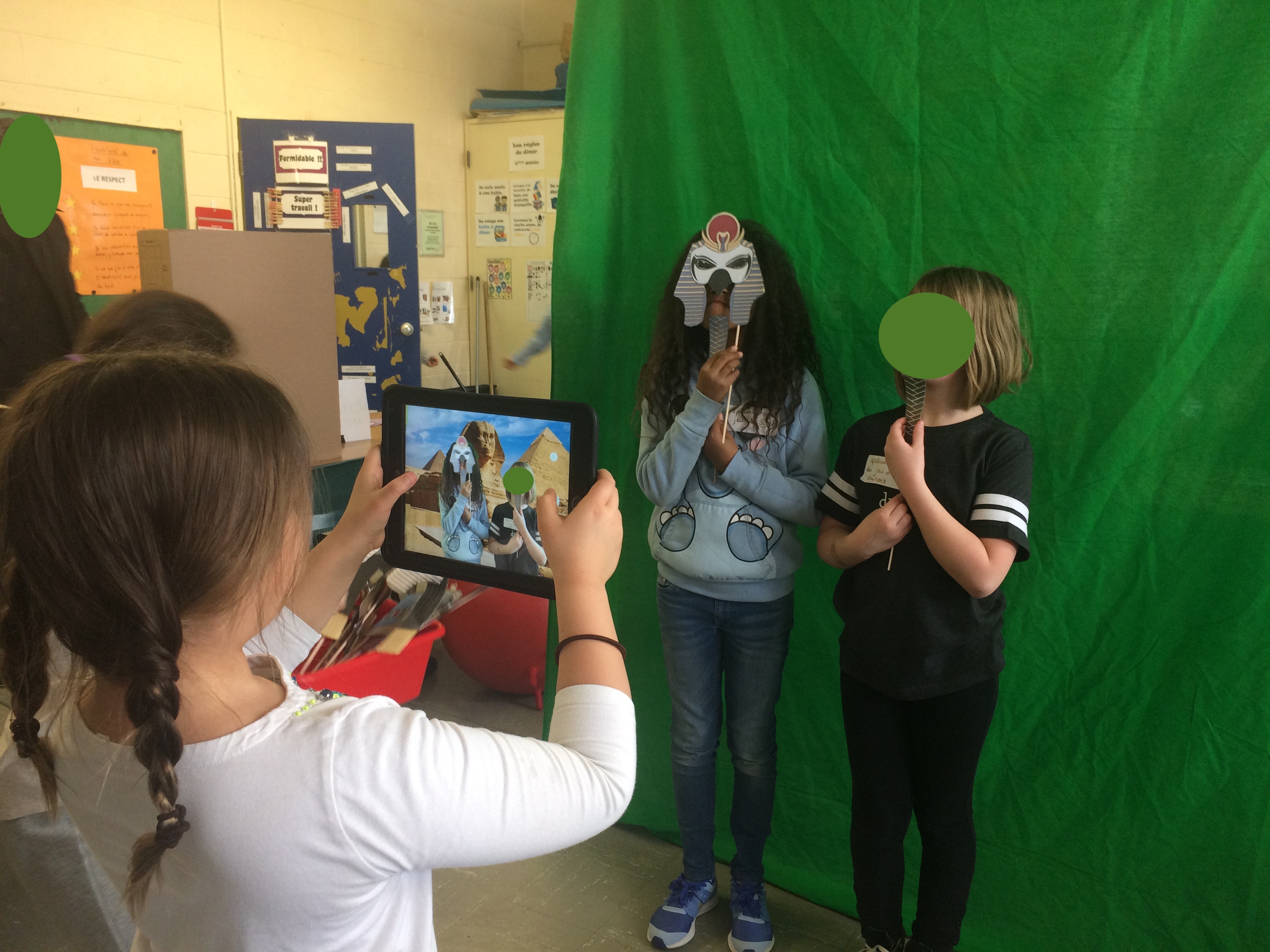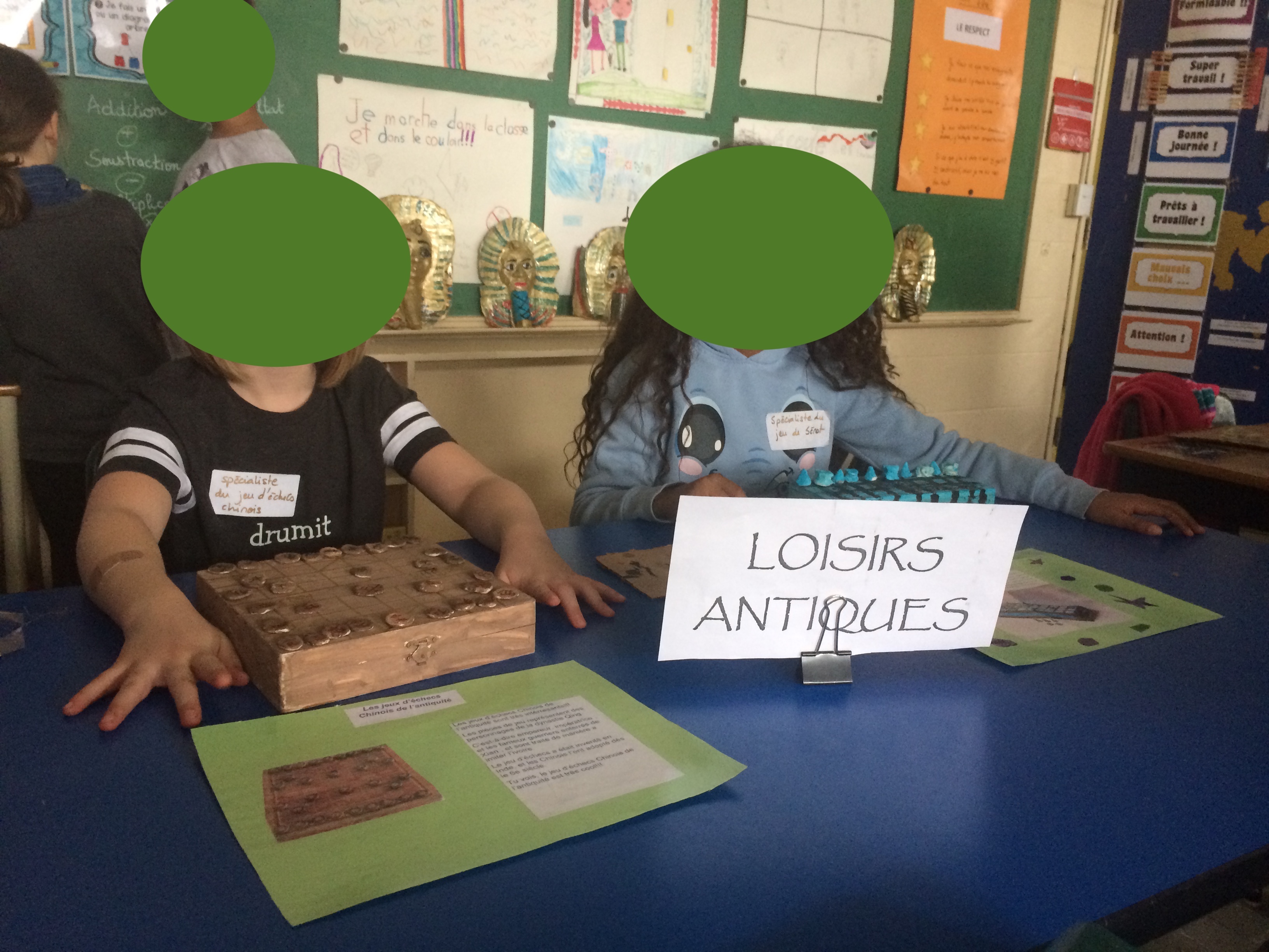 Le musée comprenait: les présentations artéfacts des élèves et leur paragraphes, une activité d’écriture antique (hiéroglyphes, runes ou écriture chinoise), et un petit photomaton des civilisations antiques, où les visiteurs, devant un fond vert, pouvaient se prendre en photo devant des sites archéologiques de ces civilisations.