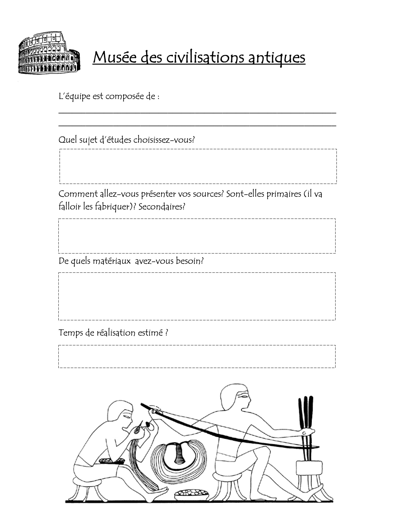 Après avoir présenté plusieurs civilisations anciennes aux élèves (Égypte Antique, Grèce Antique, Rome Antique, Gaulois, Vikings, Chine Antique), ils se plaçaient librement par groupe et choisissaient une civilisation en particulier, et un thème d’enquête (moyens de transport, architecture, vêtements, loisirs, technologies, etc.).